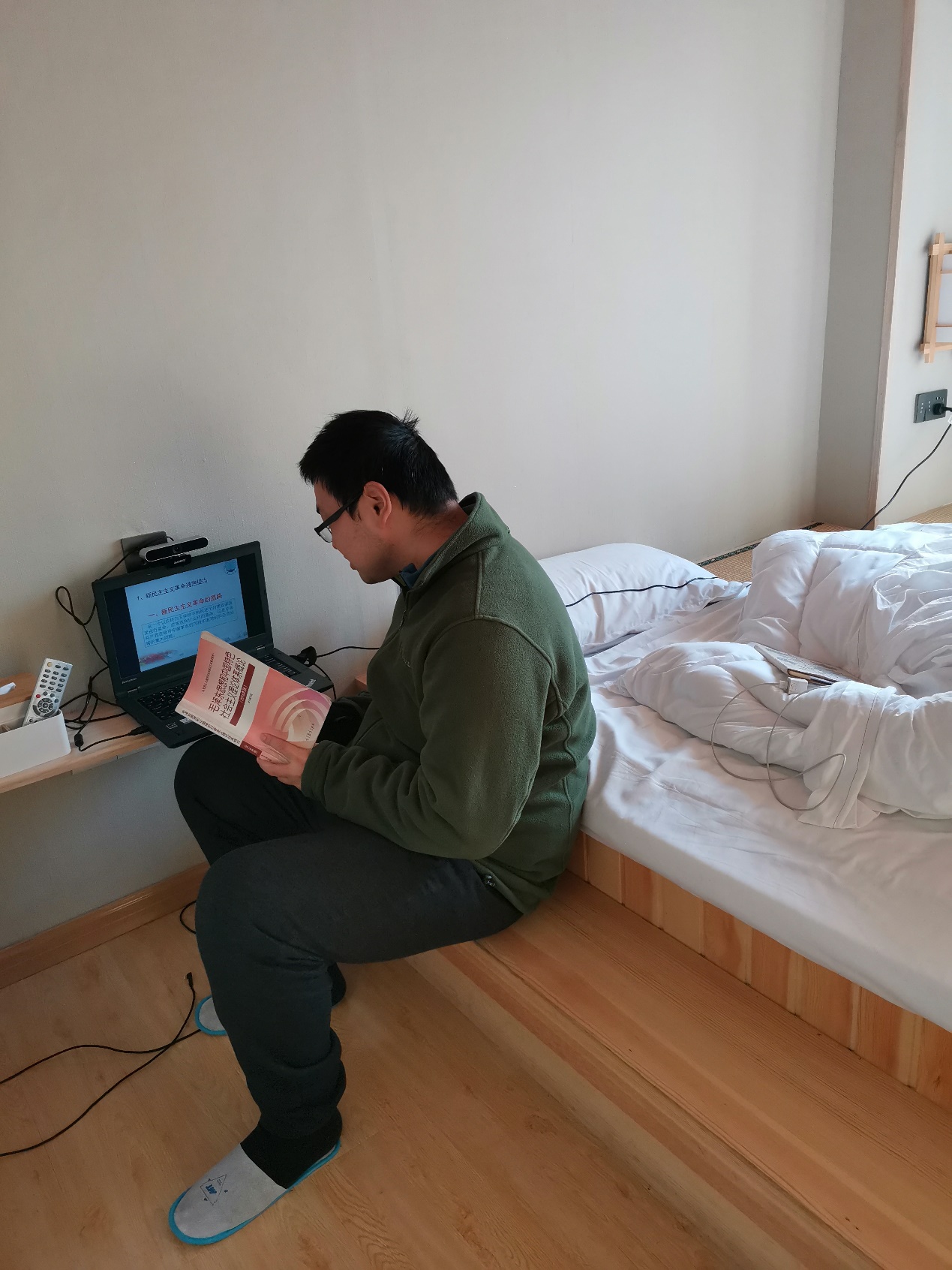 这种特殊情况,发生在常人身上,恐怕早就超出了心理负荷,方寸大乱了。学院领导知道邓老师的情况后,连忙关心问候,并安排相关老师对接邓老师的直播教学,希望能够给邓老师肩负。但邓老师有大将风度,“每临大事有静气”。他虽然好不容易有一个宾馆可以容身,但一路奔波时始终惦记着教学。去汉口之前,就做好了继续直播的准备,带好了教材和笔记本电脑。邓老师说:“在宾馆里也只能等待,想去医院帮她也帮不上,我还在继续直播吧。”就这样,邓老师扛住巨大的精神压力,在简陋的条件下,继续给学生献上精彩纷呈的课程。终于到3月11日,三次核酸检测的结果都是阴性。刘老师和她的母亲都排斥了感染的可能性,孩子也非常健康活泼。邓老师终于苦尽甘来,一家人团聚。