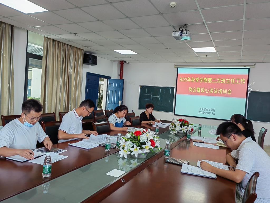 在文科楼1104室召开本学期第二次班主任工作会,专题开展谈心谈话培训。学院党委副书记马小佼、全体辅导员及班主任参会。