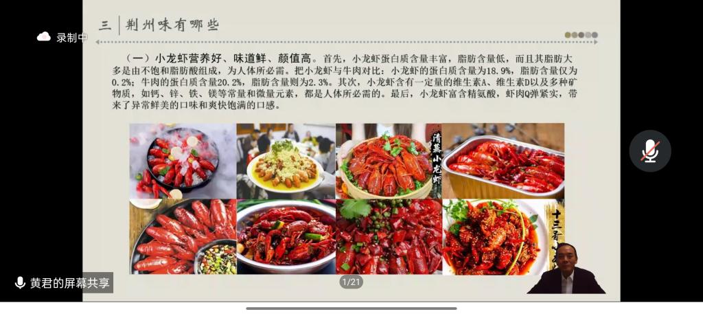 (文张晓燕 图张夕雨)10月12日晚,我校大型思政公选课《生命长江》第八季第四讲:《荆州之味》在腾讯会议开讲,中共荆州市委宣传部常务副部长黄君带领同学们品味“荆州之味”。