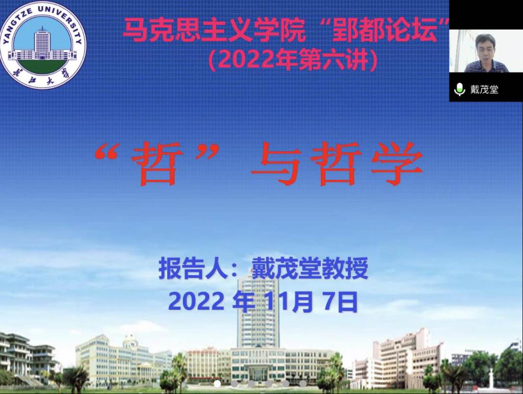 “郢都论坛”2022年第六讲,在文科楼1104会议室和腾讯会议以线上线下相结合的方式同步举行。本次讲座的主讲嘉宾为北京师范大学哲学国际中心的戴茂堂教授,他以“‘哲’与哲学”为主题,深入浅出地解析了哲学的意涵,还原了哲学最本真的内容。讲座由学院副院长涂江波老师主持,学院100多位师生参与聆听。