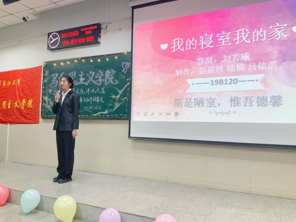 思政之音,寻真理之光芒;寝室文化,亮劳动之风采。各寝室代表依次上台进行汇报展示,围绕“以劳育美,以爱同行”这一主题分别从寝室成员介绍、生活学习、文化装饰等方面展现温馨健康的寝室氛围、丰富多彩的寝室生活。内容充实丰富,形式新颖多样,在十位寝室代表的展示中,寝室风采遍布学校每一个角落,自导自演的情景剧《错位时空的对话》、《防疫版甄嬛传》,歌曲舞蹈串烧《失恋战线联盟》、《告白气球》串起团结之心,汇集浪漫雅致。正如答辩选手所说:“仰望星空,笑靥如花,情谊的故事还将继续,青春的道路依然光明璀璨。”