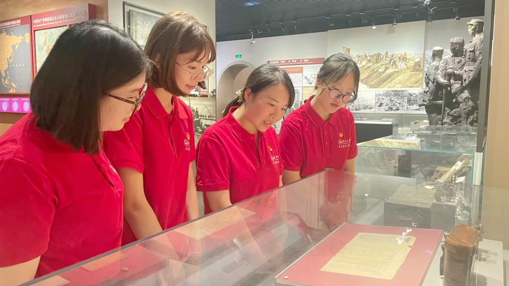 (图为“信·荆楚”暑期实践队队员在展览大厅重温入党誓词)