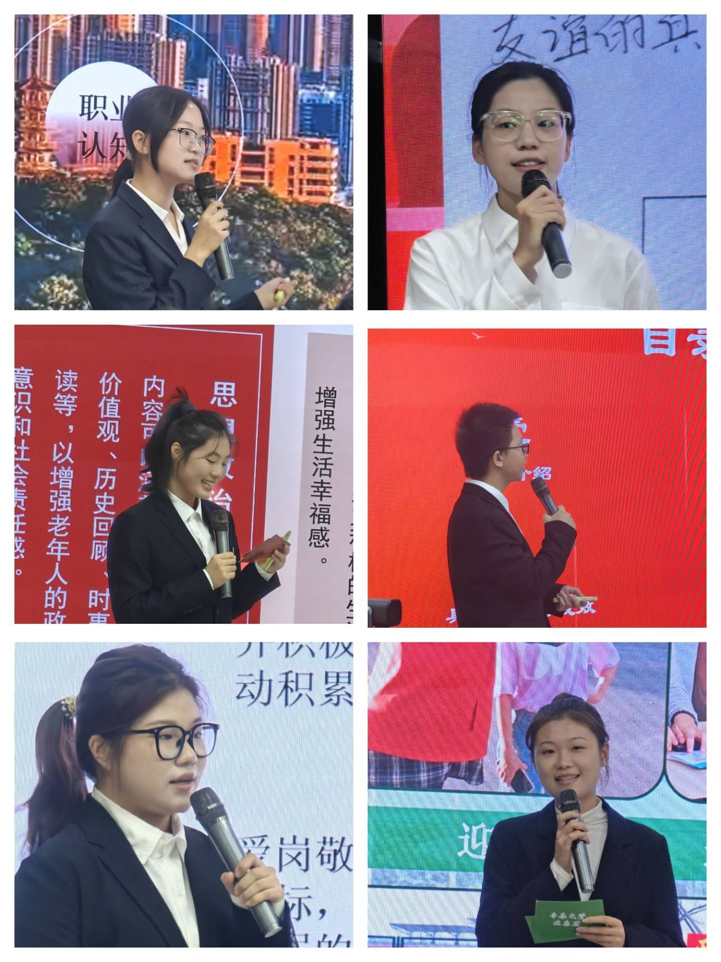 本次比赛分为成长和就业两个赛道。成长赛道上,高宇桐等6名选手围绕职业目标,展示发展规划及实现目标的具体行动。就业赛道上,袁田等6名选手围绕个人求职意向,职业准备情况进行了就业能力展示。