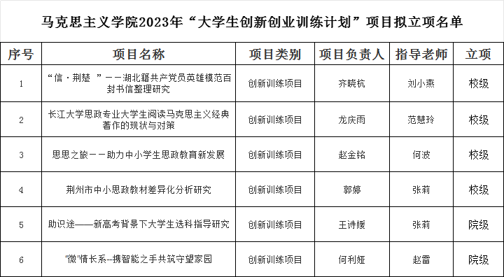 根据学校《关于我校第十六批“大学生创新创业训练计划”项目申报的通知》,以及a片无码 《2023年a片无码 “大学生创新创业训练计划”项目申报答辩通知》相关安排,通过学生项目申报汇报答辩,专家评审,拟推荐刘小燕老师指导的《“信·荆楚 ”——湖北籍共产党员英雄模范百封书信整理研究》等4个项目项作为校级大学生创新创业项目,拟推荐张莉老师指导的《助识途——新高考背景下大学生选科指导研究》等2个项目为院级项目。具体名单见附件。