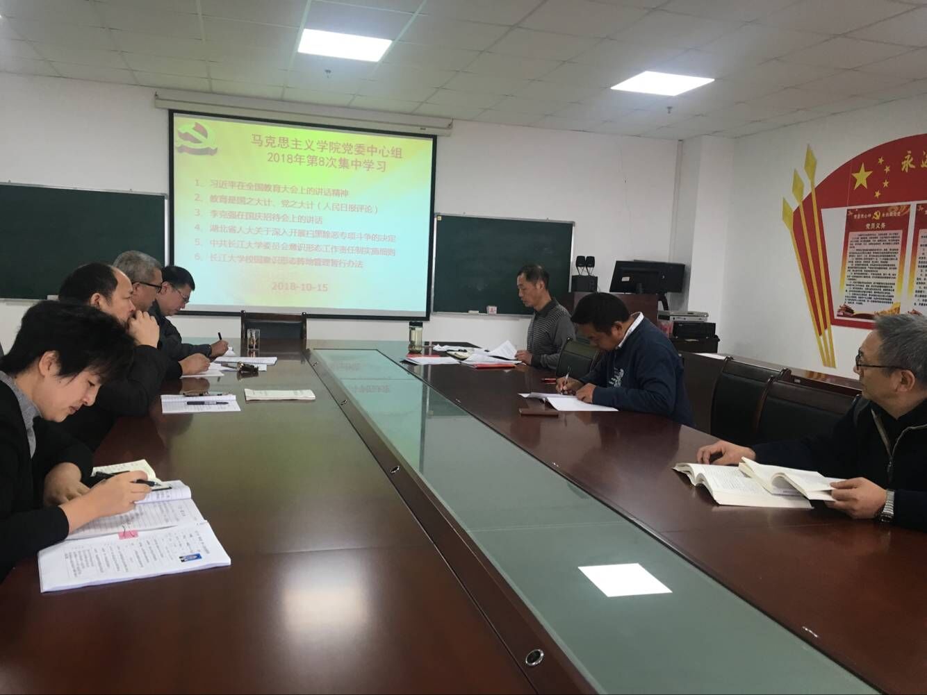 于2018年10月15日在文科楼1104室举行了党委理论学习中心组第八次集中学习,党委理论中心组成员及各支部书记参加了学习会,会议由党总支书记吴智勇主持。