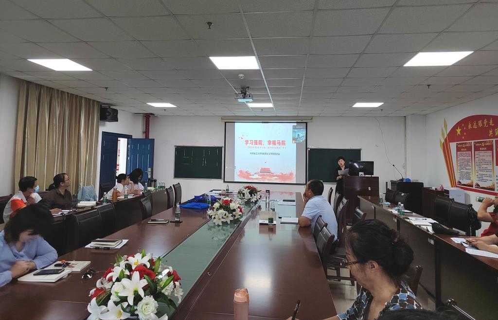 在文科楼1104室举行9月份教职工政治理论学习活动,会议由副院长涂江波主持,全院教师以线上线下相结合的方式参会。