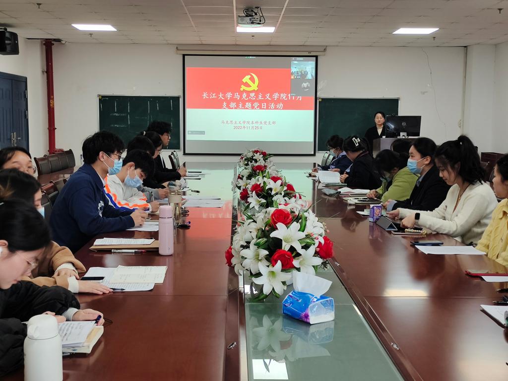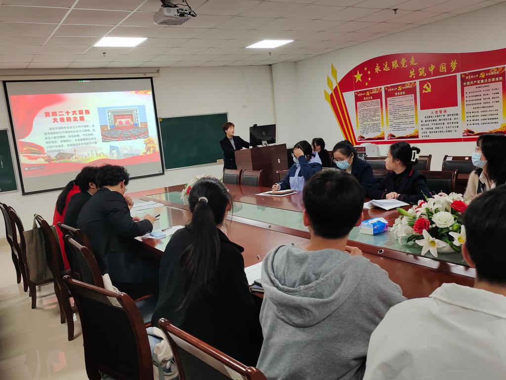 本科生党支部齐聚文科楼1104室,共同学习研讨党的二十大精神,本科生党支部书记马小佼进行党的二十大报告微党课授课。