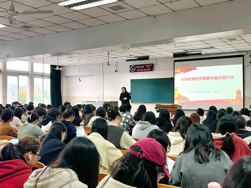 刘小燕从历史渊源、中心任务、中国特色、本质要求、战略安排、重大原则、实践部署及历史意义八个维度讲述中国式现代化。她指出,中国式现代化是中国共产党和中国人民长期实践探索的成果,是实现中华民族伟大复兴的必由之路。同时,为帮助同学们深入理解中国式现代化的内涵,刘小燕结合国际国内形势与典型历史事例,重点剖析了中国式现代化的历史脉络,生动展现了这一道路的形成与发展。在阐释的过程中,刘小燕全面深刻地分析了中国式现代化的五大特征:这是人口规模巨大的现代化,是全体人民共同富裕的现代化,是物质文明和精神文明相协调的现代化,是人与自然和谐共生的现代化,是走和平发展道路的现代化。她的讲解条理清晰,深入浅出,使在场学子对中国式现代化形成了清晰认知,明确了中国未来的发展方向。