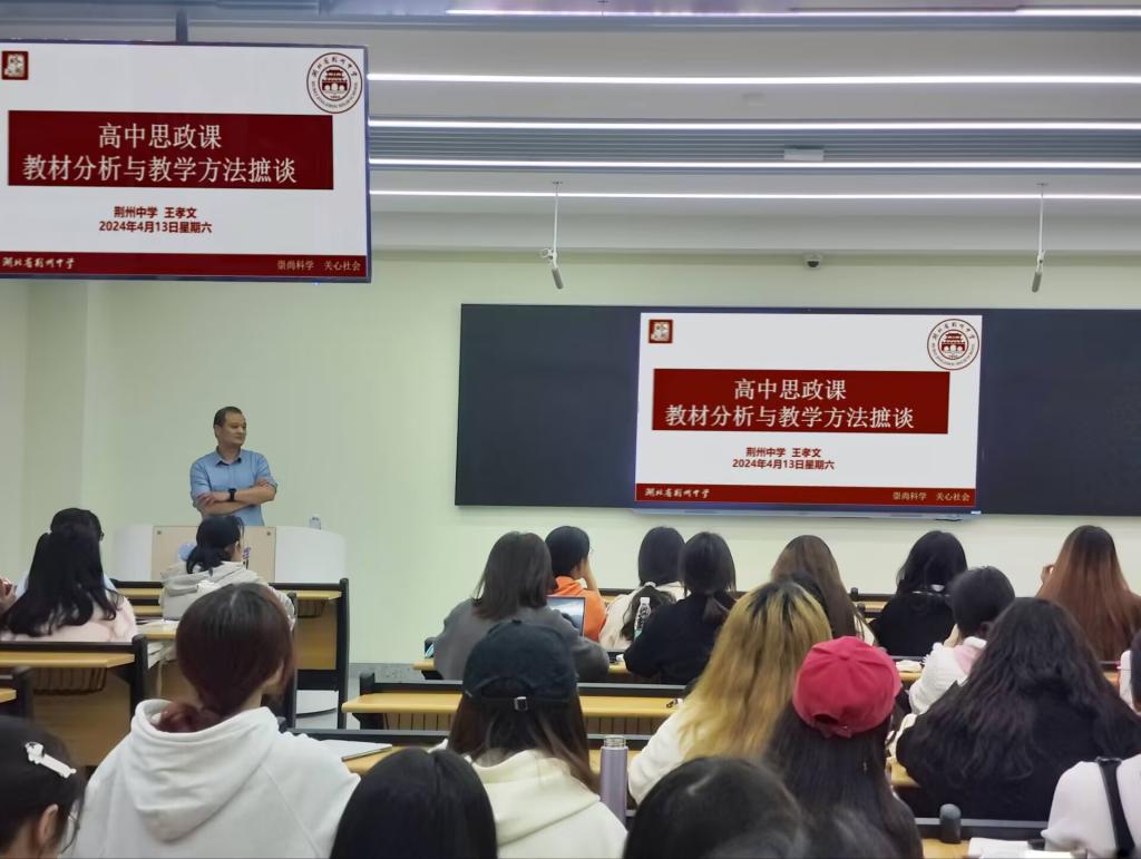 于16教A312室开展教学论坛第五讲。本次讲座由荆州中学高级教师王孝文担任主讲,学院本科生以及学科教学(思政)专业研究生参与讲座。