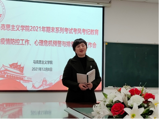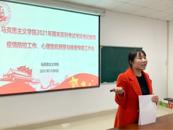 在文科楼1104室召开期末系列考试考风考纪教育及疫情防控工作会议,本次会议由学工办主任张云雾主持,学院党委副书记马小佼、辅导员李敏出席会议。本研各班级的班长、团支书、副班长兼安全委员、心理委员及学生会、研究生会主要成员到场参会。