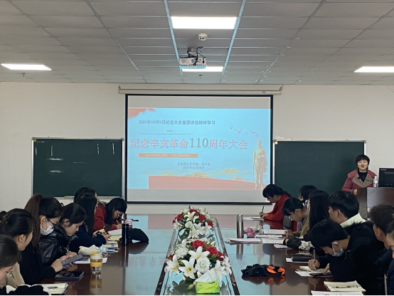 党委副书记马小佼老师担任主讲人。马书记从“纪念辛亥革命110周年大会的会议概况、革命成果、革命意义、大会讲话的全文内容、大会总结”共五个版块进行了讲解,带领学员们重温了孙中山先生“唯愿诸君将振兴中国之责任,置之于自身之肩上”的讲话,并着重强调我们要有捍卫国家主权和领土完整的坚强决心、坚定意志、强大能力,呼吁同学们发扬孙中山先生等辛亥革命先驱的伟大精神,携手向着中华民族伟大复兴的目标继续奋勇前进,为实现祖国完全统一的历史任务共同努力。