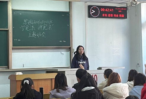 11月8日,思政20级全体学生于13教B310开展“学宪法 讲宪法”主题班会,会上,思政12002班李春燕向同学们普及了国家宪法日暨全国法制宣传日等法治知识,讲述了国家宪法日的设立意义,倡导大家作为新青年应主动弘扬宪法精神、履行宪法使命。