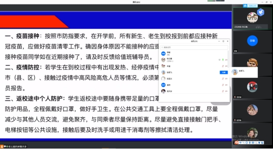 开学在即,做好疫情防控是当前的头等大事。张云雾对于新冠疫苗接种、疫情防控、返校途中个人防护、到校报到流程及返校后的疫情防控相关规定均进行安全提示。同时,她强调,返校报到安全工作应落实到班级,各班级应在规定时间内完成学生申请返校的信息统计和反馈,并按要求开展秋季返校报到主题班会,宣讲学校返校工作方案,开展安全教育。