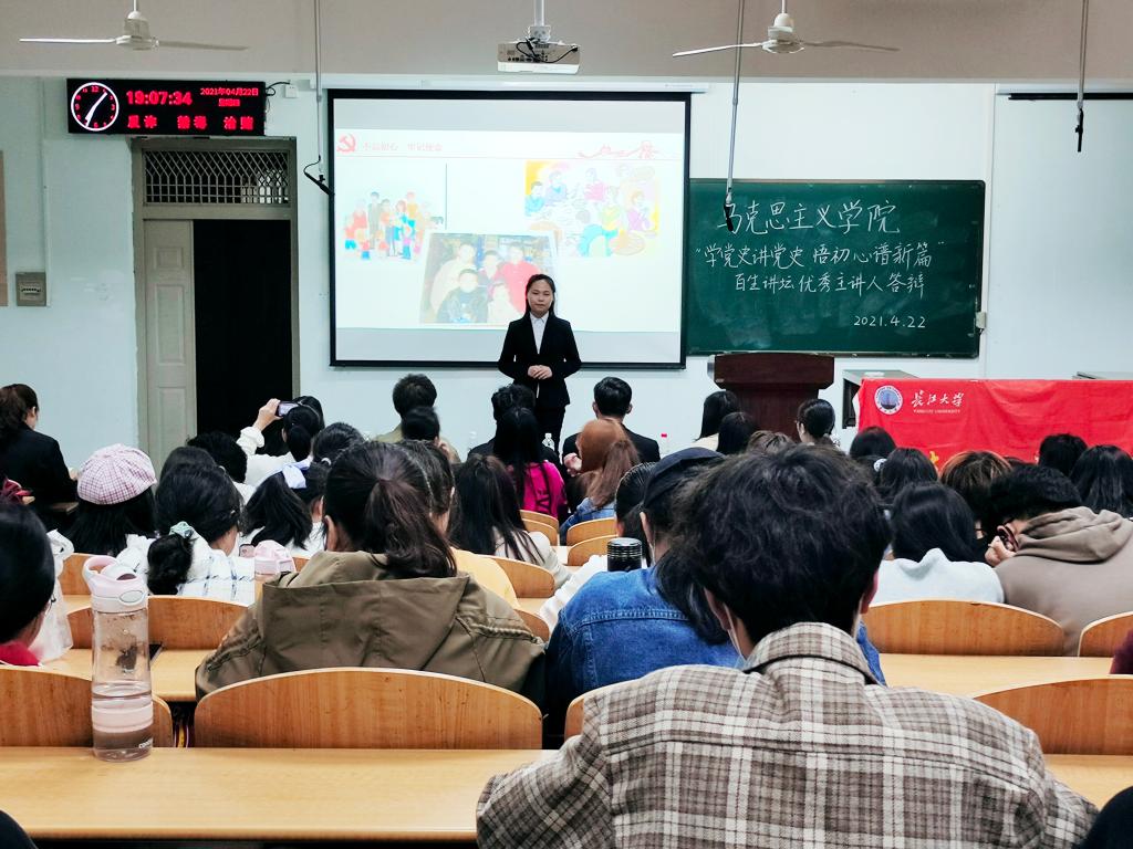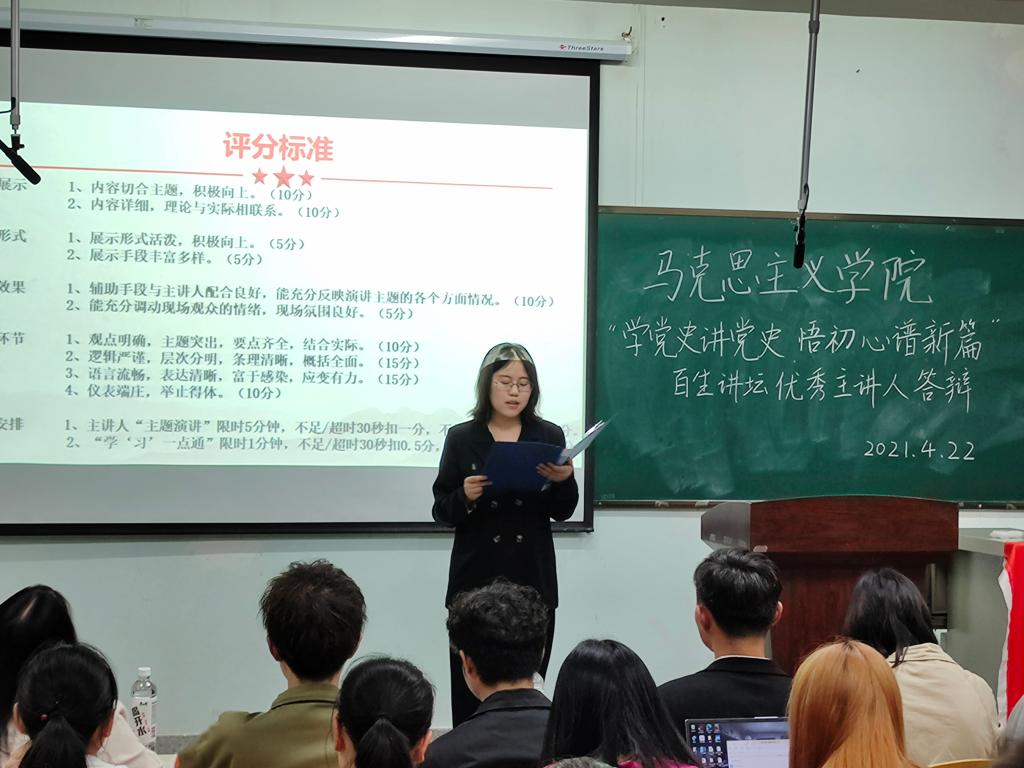 思政11901班许幸围绕“不忘初心,牢记使命”这一主题展开,由党的伟大领导过渡到个人家庭的故事。思政11902班张馨月讲述了这些年来祖国和好友的家乡发生的巨大变化,证实了中国共产党坚持为人民服务的宗旨,努力改善人居环境。思政11902班罗蓉以“勿忘峥嵘,争做后浪”为宣言,通过自己高中时期历史学习的经历和感受带领同学们忆往昔峥嵘岁月、歌颂革命先烈叶挺将军,号召大家要高举马克思主义的科学旗帜,增强新青年的责任感和使命感。