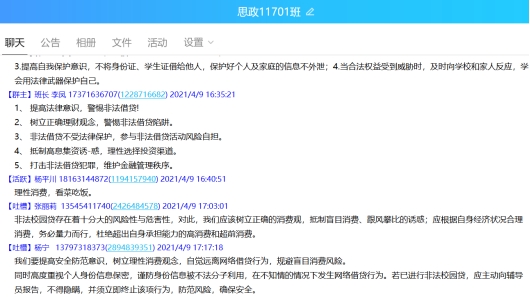 4月7日至4月9日,各班级有序开展防范非法校园贷主题班会。各班级在QQ群分享防范非法校园贷的相关知识和视频,组织同学集中学习和观看,并在进行交流分享。为了强化同学们的风险意识,各班安全委员组织开展了围绕抵制不良网贷、共建和谐校园的主题班会,由班委主持发言,并向同学们讲述科学面对校园贷、解决校园贷的方法途径,并同时提醒同学们要学会用法律的武器保护自己。