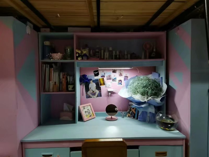 未进门便被寝室门上的手工挂牌吸引了目光,张云雾老师对此的评价是环保又新意,推开门同学们各个热情似火,纷纷递上茶水,水果和糖果。纵览各个寝室装饰风格各有特色:有的风格统一,恬淡温柔;有的风格各异,正如李敏老师所说整体呈现“彩虹妙妙屋”风;也有男生寝室的猛男风,球星照片牢牢占据大半墙壁。