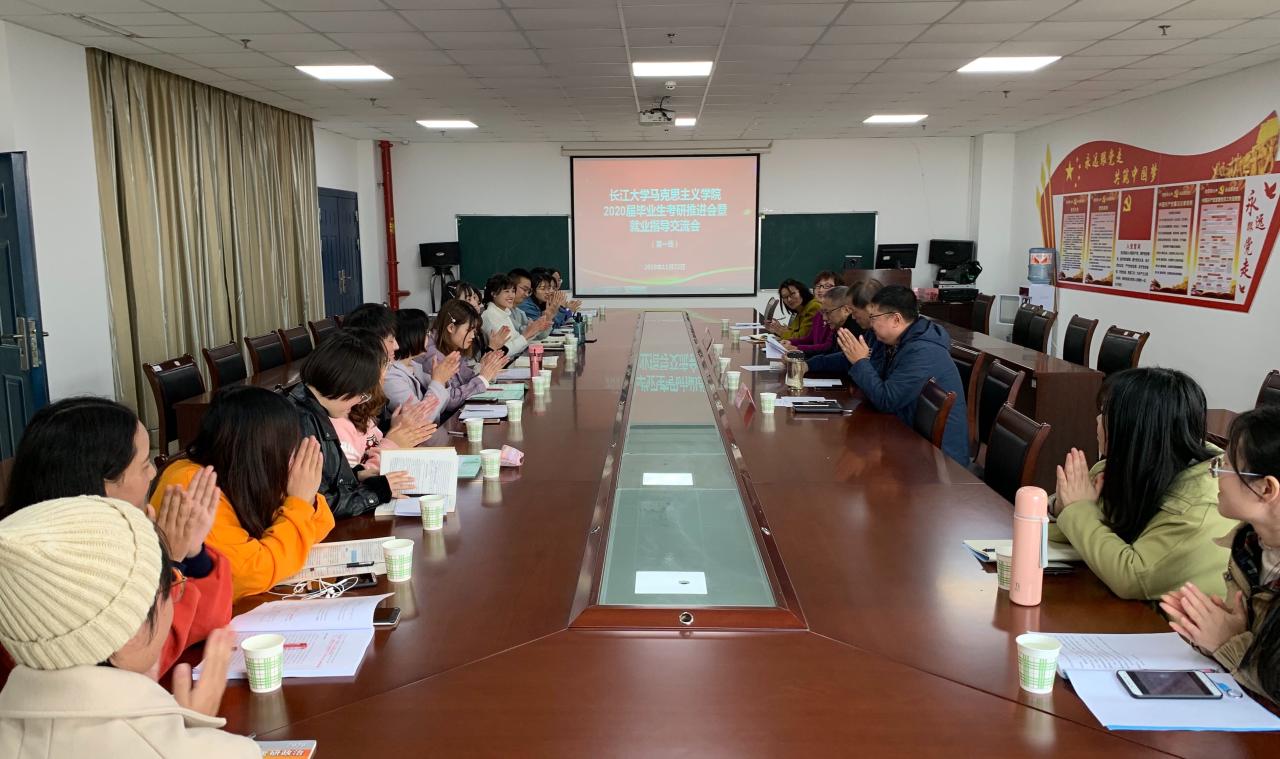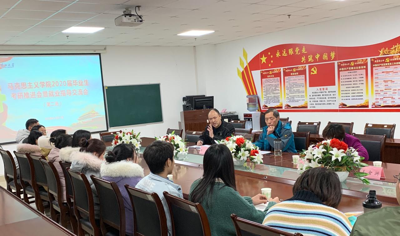 2020届毕业生考研推进会暨就业指导交流会第一场和第二场在文科大楼1104会议室有序开展。学院院长姜学勤、党委书记吴智勇、党委副书记马小佼、教授王金洲、院长助理兼思政11602班班主任谷军、思政11601班班主任邓亚中、青年博士张莉及全体本科毕业生参加了交流会。