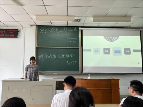本次班会组织从防溺水安全教育、疫情防控教育、反诈骗安全教育、诚信应考及考风考纪教育四个方面进行开展。主讲人刘玉玲给大家播放了溺水事故相关视频并讲授了相关安全常识及溺水自救方法。并强调了学校疫情防控要求,督促同学们按时打卡、按要求进行核酸等。在安全教育部分的最后,大家一起学习了反诈骗相关知识,了解了诈骗团伙常用套路与相关反诈措施。主讲人王子怡向大家强调了诚信考试规范,带领同学们学习了a片无码