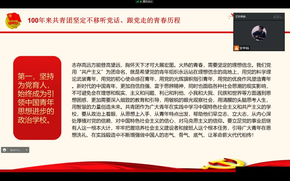 本次主题团会各支部均采取线上进行学习。21级两个支部紧紧围绕“青春心向党,百年再启航”团会主题,采取问答形式,依次从“主席回信、法治教育、与党同心、美丽中国”四个方面展开学习,让成员们对国家的发展理念与生态环境建设的思想内化于心;20级支部的团会旨在阐明共青团和青年工作的历史经验和总结,使成员们了解习近平总书记对当代青年的殷切希望,“做理想远大、信念坚定的模范,做刻苦学习、锐意创新的模范,做敢于斗争、善于斗争的模范,做艰苦奋斗、无私奉献的模范,做崇德向善、严守纪律的模范。”思政12001团支部还邀请了几位团员分享自己的社会实践经验和体会,学习了“理论知识”和“实践内容”,给大家分享了作为青年应该做什么,怎么做的想法;研究生支部为成员们播放了一系列短片,以此来展示新时代青年拼搏奋斗的故事,并激励全体团员向模范学习,坚定不移跟党走,积极投身于建设中国特色社会主义的伟大事业之中。21级学硕的团员李金润说:“作为一名新时代青年,我明白自己肩上的重担,继承革命先辈伟大精神,学习同辈青年不懈奋斗的品质;作为一名共青团员,我们也要坚定理想、主动担当、增长才干,以自强不息的精神、朝气蓬勃的姿态,奋力谱写中华民族伟大复兴进程中激昂的青春乐章。”