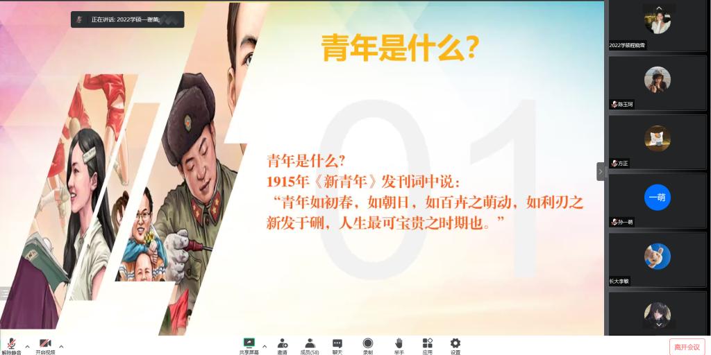 通过腾讯会议召开2022级研究生政治理论学习交流会。学院党委副书记马小佼、2022级全体研究生参加会议,辅导员李敏主持会议。