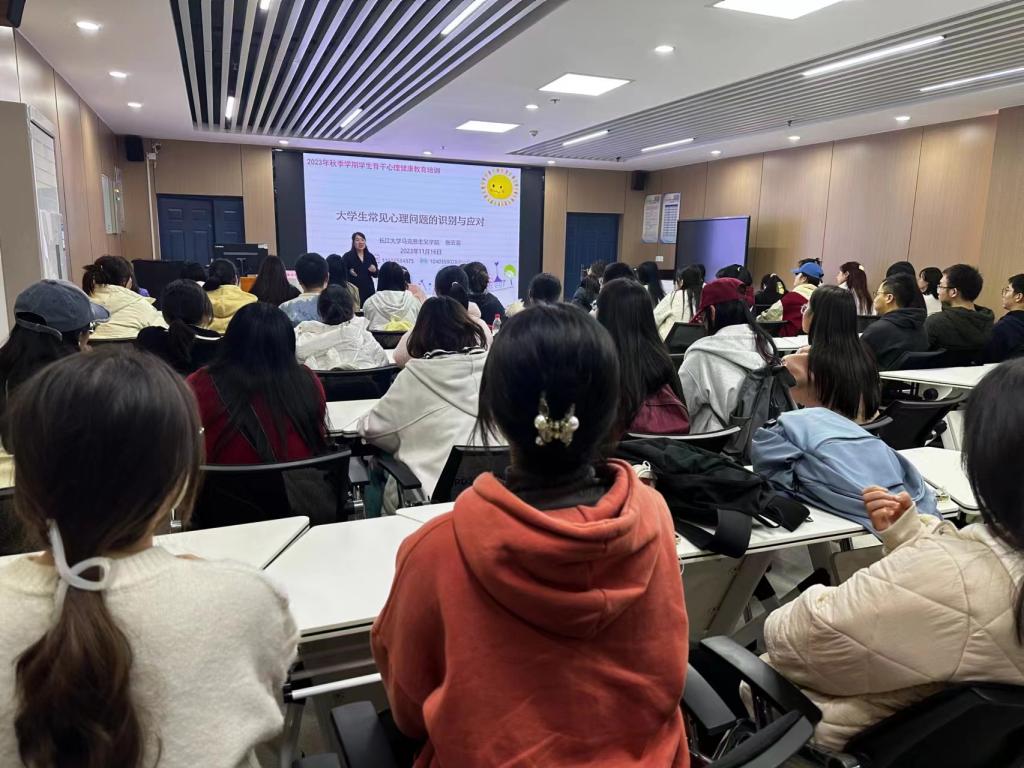 心理专干张云雾老师以《大学生常见心理问题的识别与应对》为题,从“走进心理健康、识别心理问题、学习心理援助和熟悉心理体系”等四个方面展开讲解。她强调了心理健康的重要性,围绕大学生群体的身心发展特点着重讲述了学生中常见的心理困扰。她还结合典型案例讲解了如何识别大学生中常见的精神障碍。作为一名学生干部,怎样进行自助和助人?张老师鼓励同学们扮演好“排雷兵”、“传声员”、“倾听者”和“陪伴者”的角色,遇到困扰要主动寻求帮助,发现危机线索要及时上报,还要学会倾听和陪伴。最后,她还介绍了学校四级心理健康教育工作体系和心理咨询工作安排,呼吁同学们在必要时学会寻求专业的帮助。