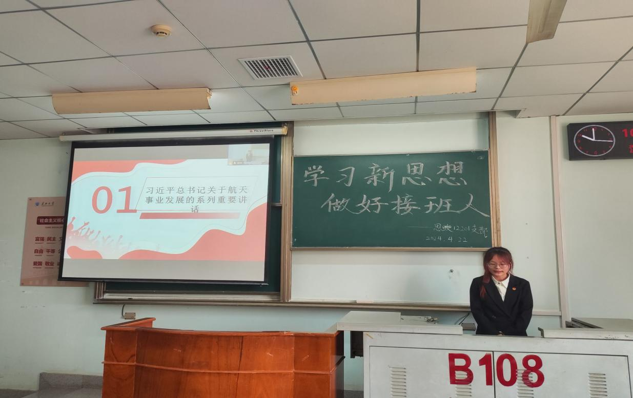 在主题团会上,思政12301团支部周奕汝同学以“学习航天精神,勇攀科技高峰”的视频引入主题,讲述了中国航天事业的发展历程,领学了习近平总书记关于航天事业发展的系列重要论述和重要指示批示精神;思政12101团支部于潇浚同学领学了习近平总书记关于科技创新的重要论述和指示批示精神,结合本人参加 “挑战杯”的赛事经历展现了青年勇于战胜一切艰难险阻、敢于攀登科技高峰的信心决心;思政12302团支部程心甜同学从孔子等诸子百家的追求谈到了新时代的爱国主义教育,她号召同学们将爱国主义、集体主义、社会主义当作自己的坚定信念和精神依靠。各班级还围绕铸牢中华民族共同体意识、践行社会主义核心价值观等内容开展了学习研讨。