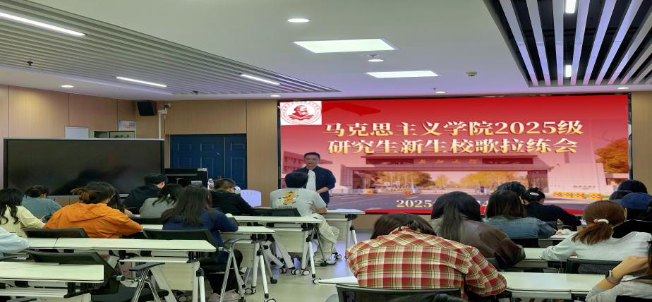 在文科楼1008会议室成功举办2025级研究生校歌传唱活动。学院学工办主任张云雾、研究生辅导员邓鹏以及全体2025级研究生共同参与。