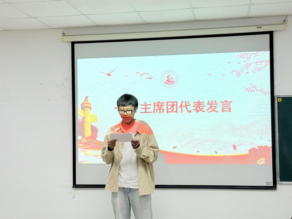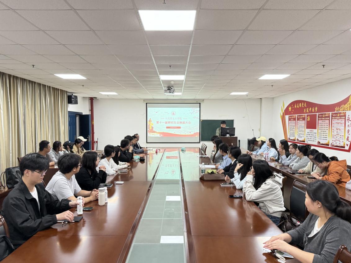 第十一届研究生换届大会于文科大楼1104会议室举行。院党委副书记竺正海、辅导员邓鹏、第十届以及第十一届研究生会全体成员参加会议。会议由马克思主义理论QX241班学生崔孔辉主持。
