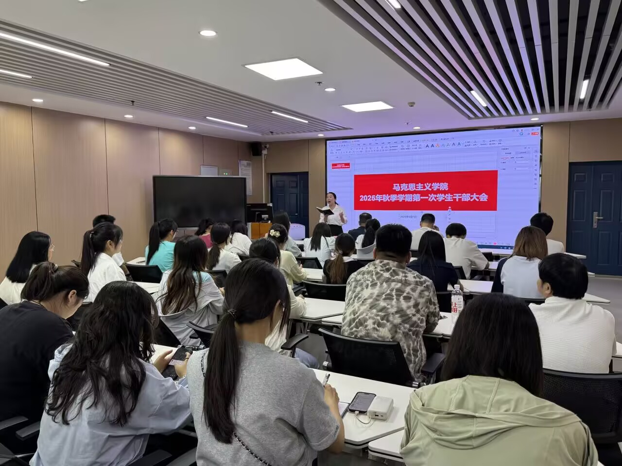 在文科楼1008室举行新学期第一次全体学生干部大会,学院党委副书记竺正海,学工办主任张云雾,辅导员邓鹏,本、研各班级的班长、团支书,以及团委学生会、研究生会主席团成员参会。