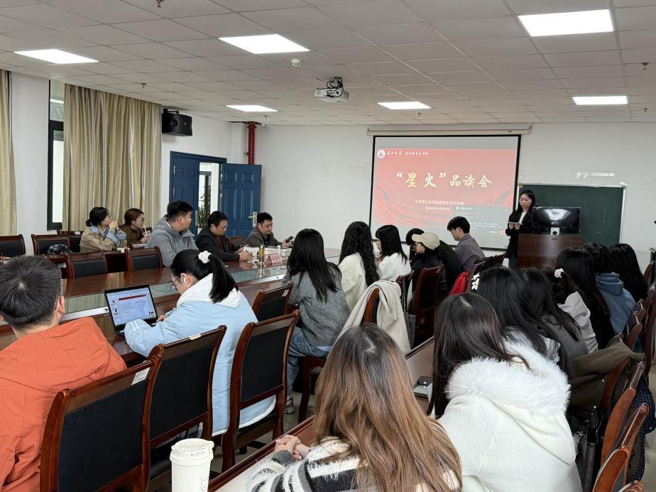 2025-2026学年第一期研究生“星火品读会”在文科大楼1104会议室顺利举行。本次活动由学院研究生会学术部章奥主持,学院副教授李振华、辅导员邓鹏出席指导,研究生会成员及2025级全体研究生共同参与。