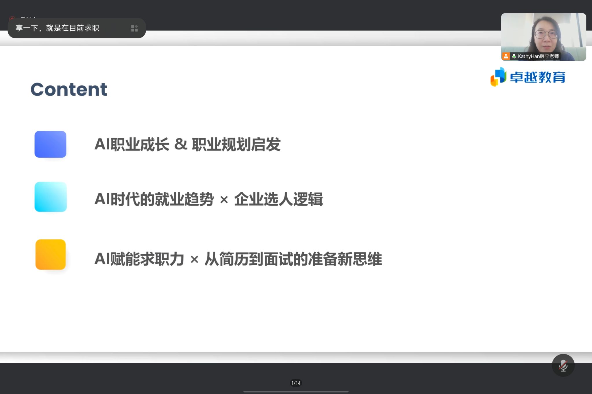邀请卓越教育集团资深人力资源专家韩宁老师以“AI时代的求职力成长课——职业规划思维启航”为题开展了生涯规划与就业指导专题讲座,学院学工办主任张云雾以及本、研学生以线上方式参与了讲座。