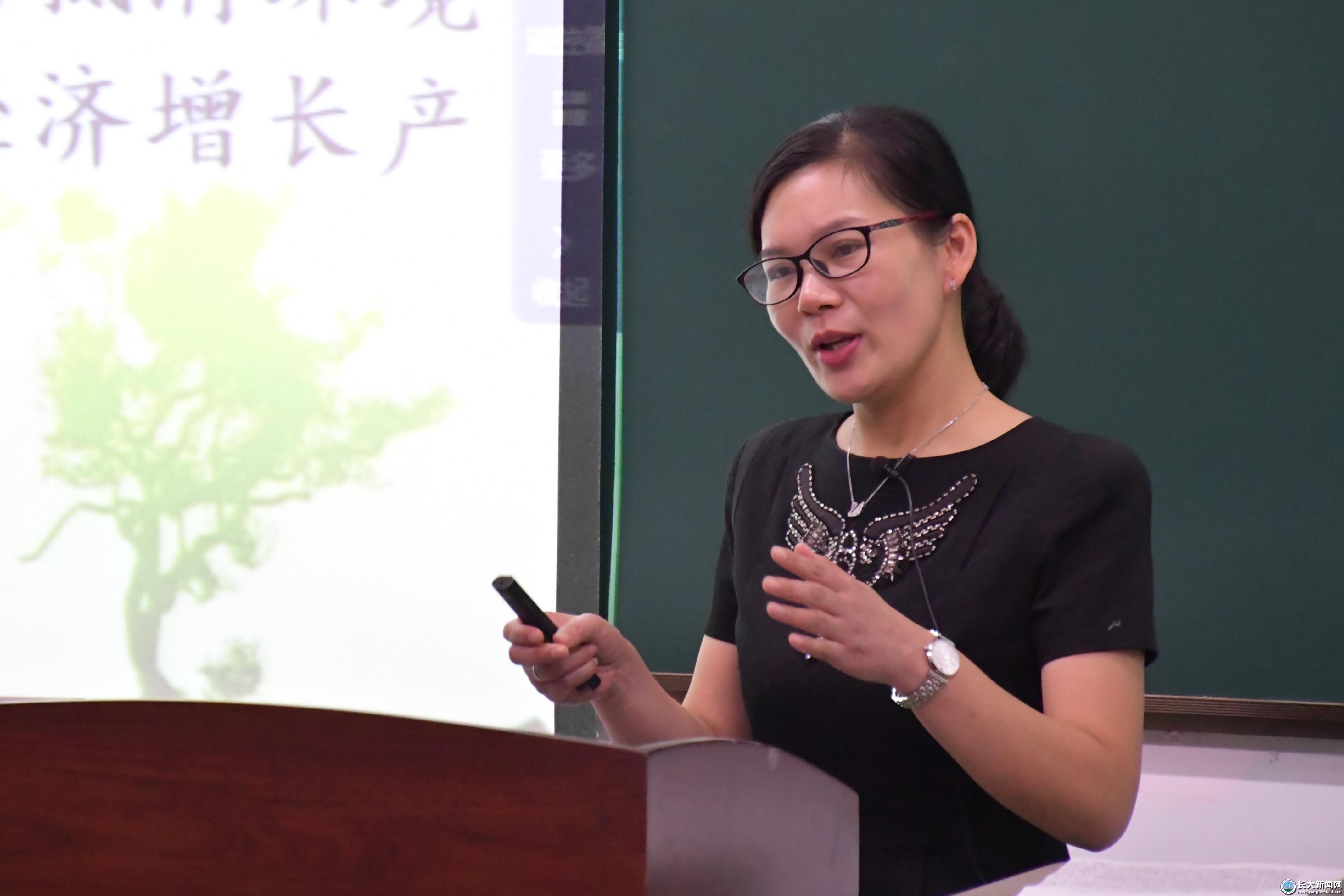 “白鳍豚的今天会是江豚的明天吗?”“在生态文明建设的大背景下,长江的生态文明建设又该何去何从?”……肖老师在抛出一连串问题后说道,西方国家的“先污染,后治理”是建立在污染转移的基础上,这与大国担当和当今中国梦是背道而驰的。中国给出的一个基本遵循是:“共抓大保护,不搞大开发,生态优先,绿色发展。”“如果经济发展和环境保护发生矛盾怎么办?”肖老师用楚源集团从衰落到重振和各行各业“绿色”盛行的事例证明经济发展和环境保护是可以兼容的。“改变不了大环境,就改变小环境,做自己力所能及的事。”最后,她引用名言作结,并激励大学生从小事做起,为保护长江、保护环境尽一份力。