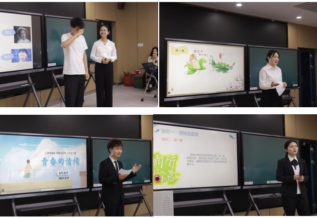 主持人宣布比赛正式开始之后,从几轮预赛中脱颖而出的10位参赛选手按照抽签顺序依次上场。1号参赛选手张晓燕发挥沉稳,通过设计小游戏环节,在轻松活跃的氛围中导入新课内容,为后面的参赛选手开了个好头。3号选手陈雅文将自己亲手制作的绒花带入课堂,围绕绒花的传承与创新,向同学们讲解了文化传承与创新相关知识;7号选手王瑾为了让学生更好地理解青春阶段的情绪,不仅自己绘制了一组情绪表情包的卡片,还让学生表演了一小段情景剧,吸引了学生注意力,使课堂氛围高涨,在授课过程中充分展示了自己作为未来教师的亲和力……紧张的竞赛在10号选手魏文婵带来的活跃有趣的课堂中告一段落。