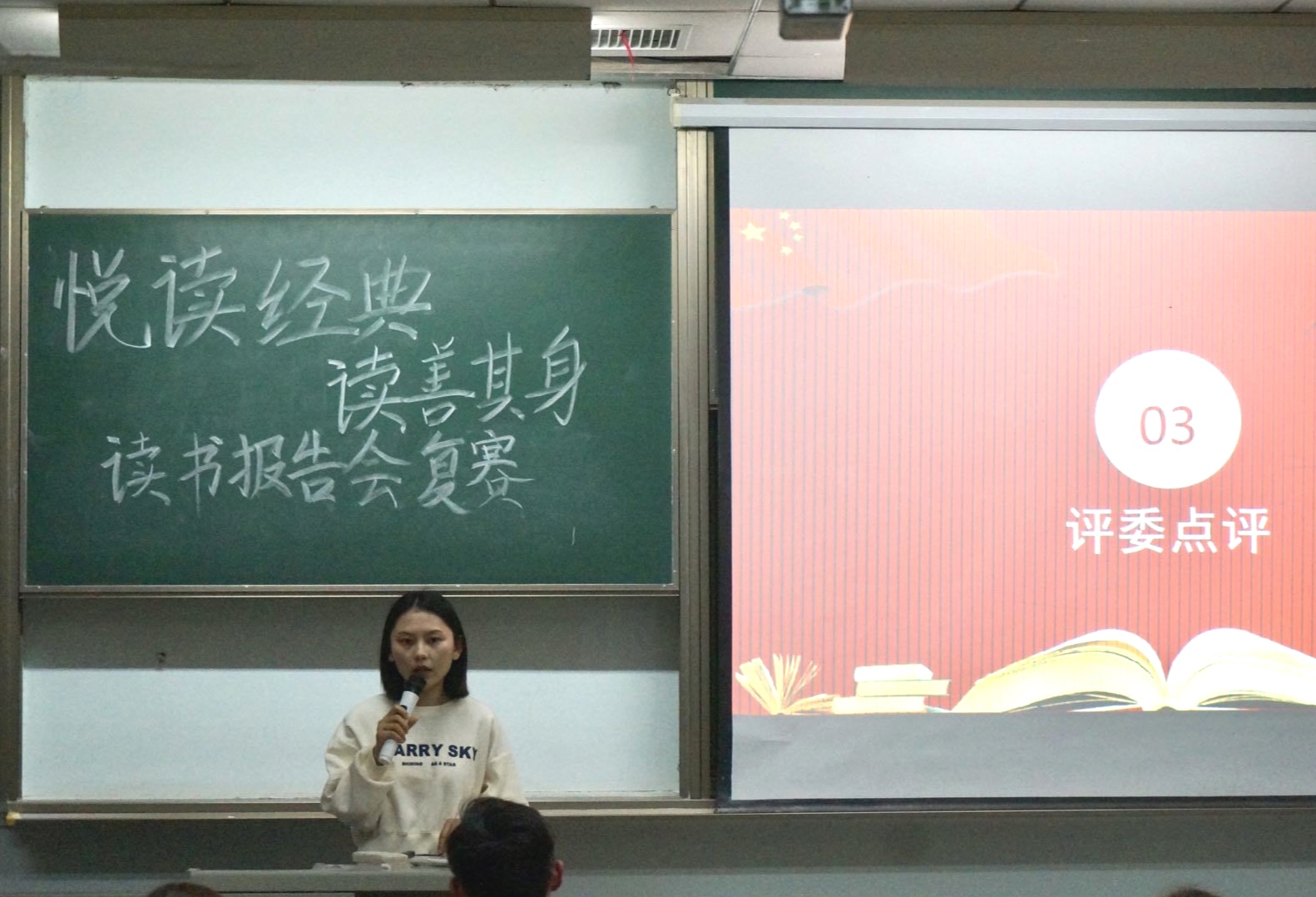 读书报告会开始,22位选手依次从书籍的创作背景,书籍内容,心得感悟进行报告。本次参赛选手介绍的书目包含了人文社科类经典书目以及红色经典书目等,每一本都是值得认真阅读的经典著作。“立身以立学为先,立学以读书为本”。观众们认真聆听,跟随着选手们的讲演,领悟了《活着》的意义,明白了《爱的艺术》,了解回顾了一段段红色的历史……选手们用精彩的表现充分展现了经典著作的魅力,也通过本次读书报告会锻炼了自己的阅读和表达能力。